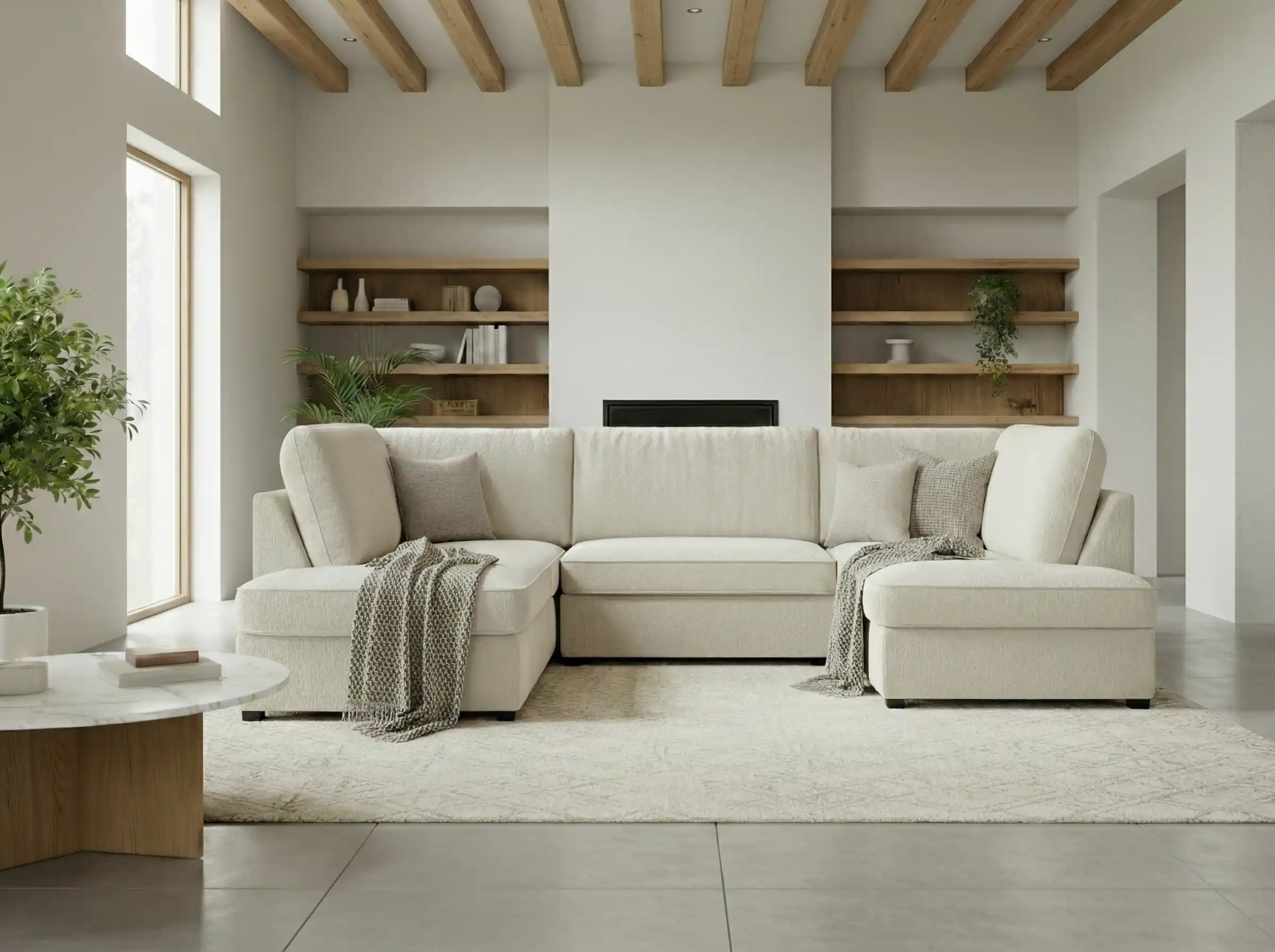 Expertly crafted, the Carnaby Sofa Boucle Beige U Shape Corner offers both comfort and style. The plush polyester fabric adds a luxurious touch, while the removable back cushions provide customizable support. Sturdy wooden feet ensure durability, and the spacious U-shape design offers ample seating space.
