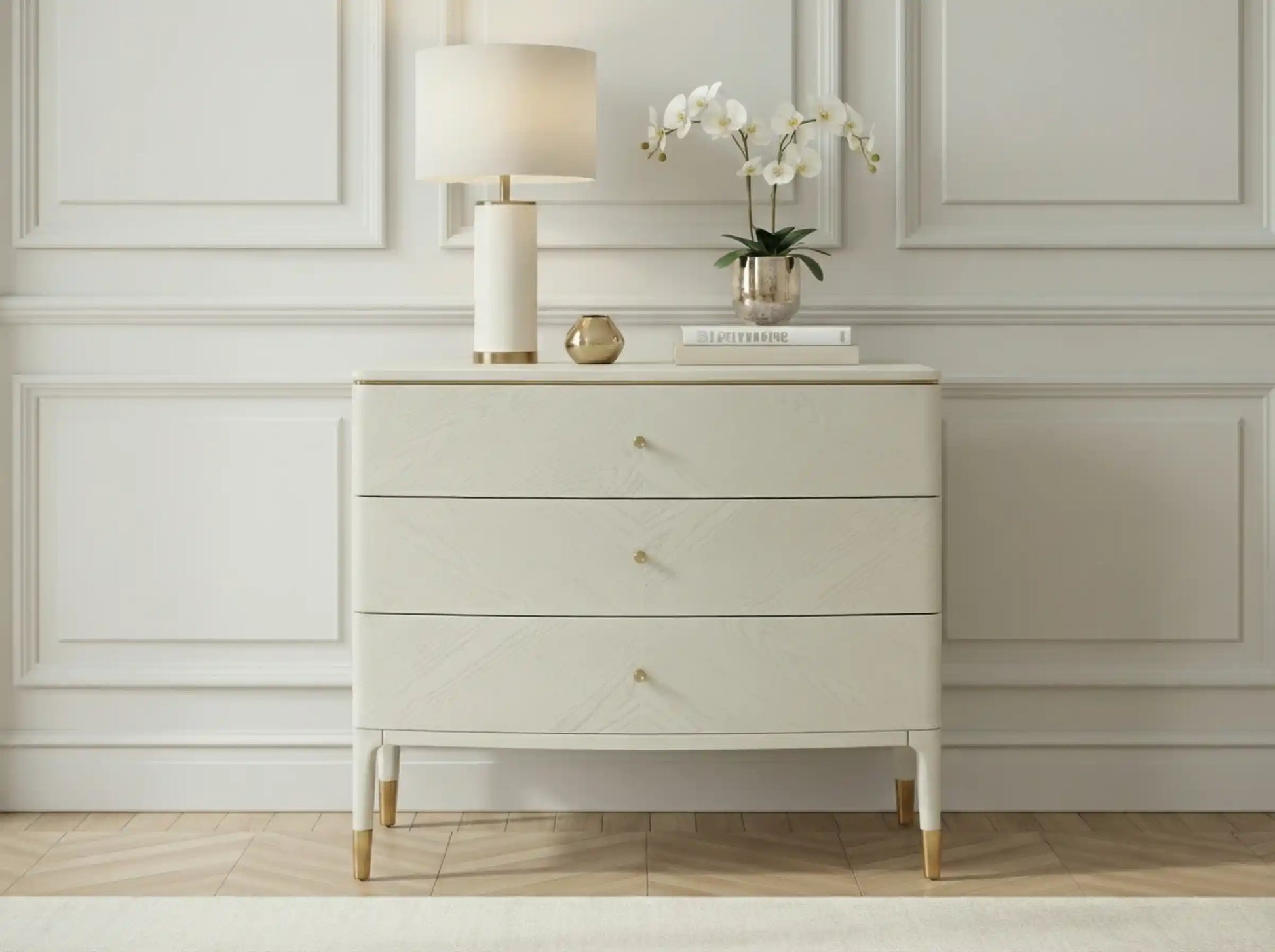 The Vancouver Chest of Drawers is a unique, timeless piece that is the perfect accompaniment to any room in a home. The classic design features 3 drawers that open with antique brass handles and are finished in a luxurious off-white shade . This piece will add a touch of elegance to any bedroom or living room. Each drawer is spacious enough to store clothes, bedding, toys, or other items. The classic design pairs beautifully with modern and traditional décor, making it perfect for any interior design style. WARNING THIS ITEM WEIGHS OVER 25KG, THIS ITEM REQIRES 2 PEOPLE TO LIFT AND INSTALL