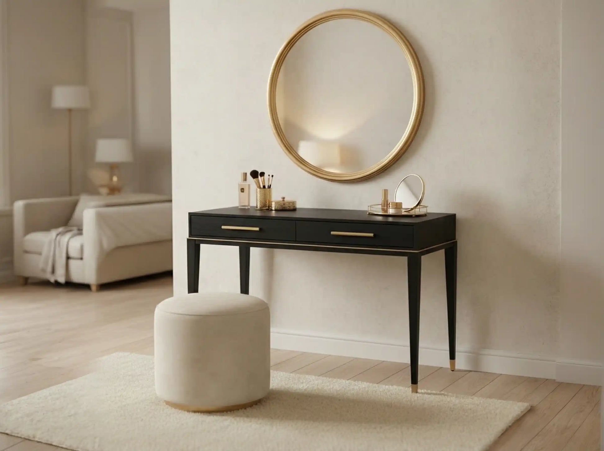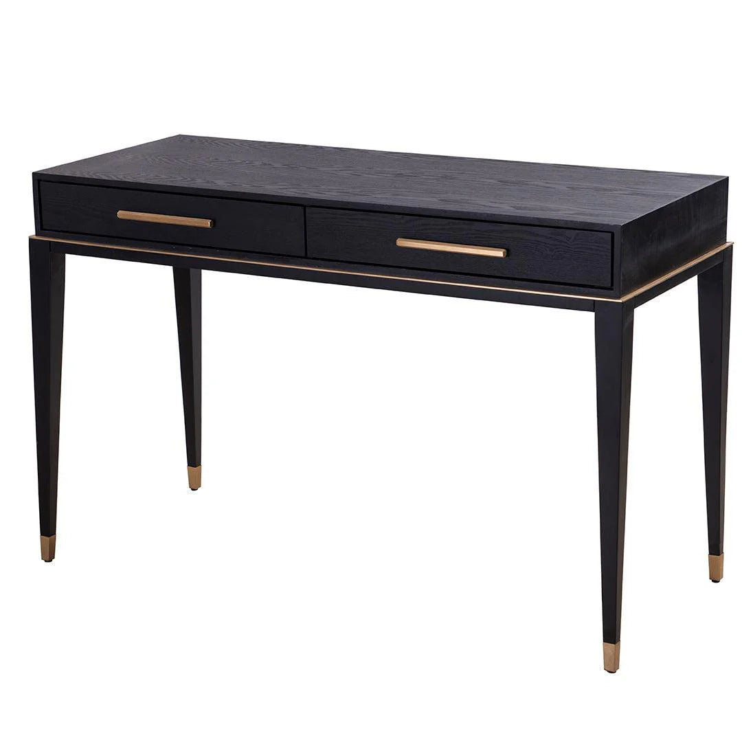 A stylish dressing table with a black finish on ash veneer and a brass trim. Perfect for many settings, from a bedroom through to a study or home office. WARNING THIS ITEM WEIGHS OVER 25KG, THIS ITEM REQUIRES 2 PEOPLE TO LIFT AND INSTALL
