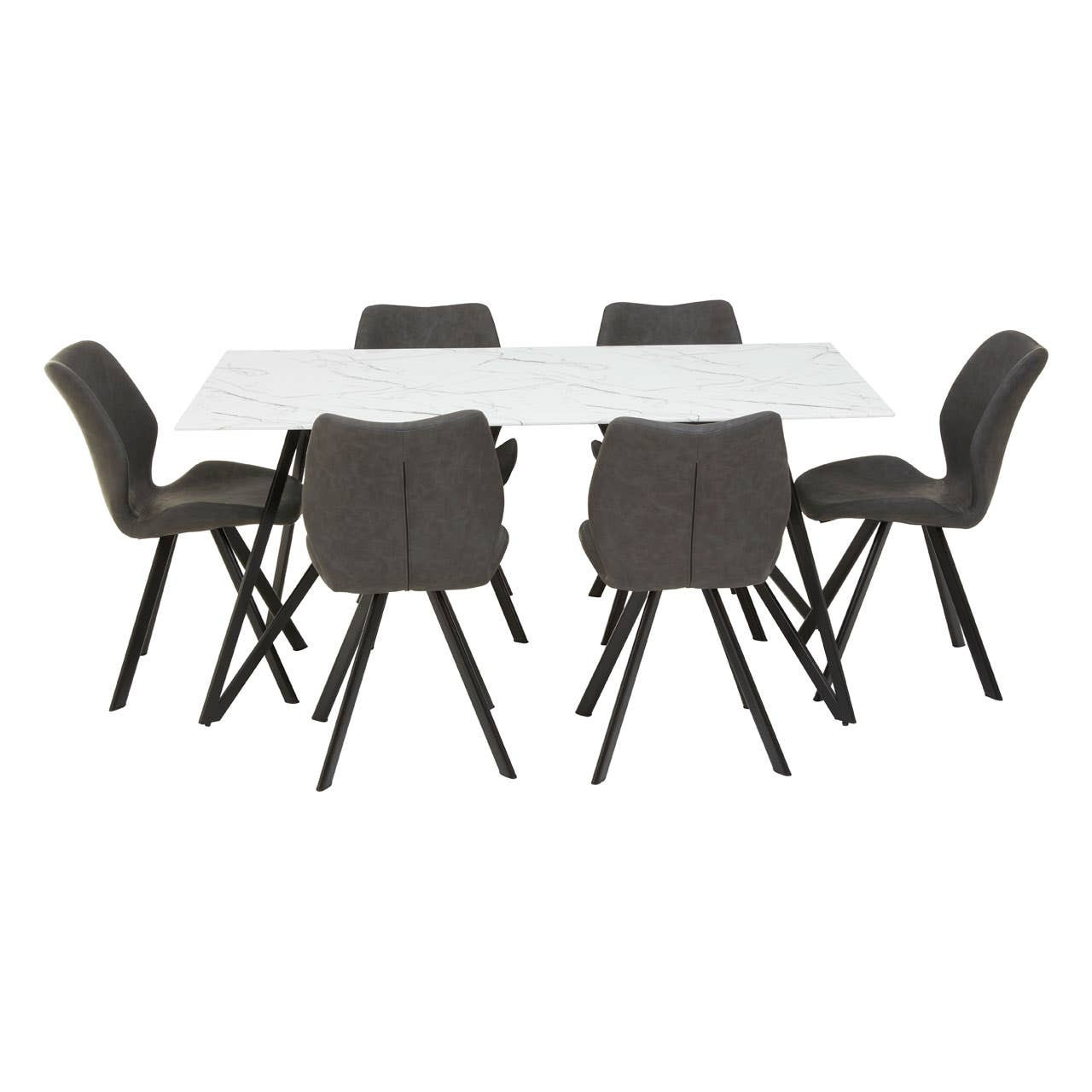 This is a modern dining set includes a tempered glass rectangular dining table with a marble effect top and six faux leather dining chairs. The set includes a rectangular dining table and six dining chairs. The tabletop is made of tempered glass, featuring a marble effect finish, and the chairs are upholstered in dark grey faux leather. The table and chair legs are constructed from metal, providing stability and durability. This dining set offers a stylish and practical solution for enjoying meals, entertaining guests, and adding a touch of modern elegance to your home.