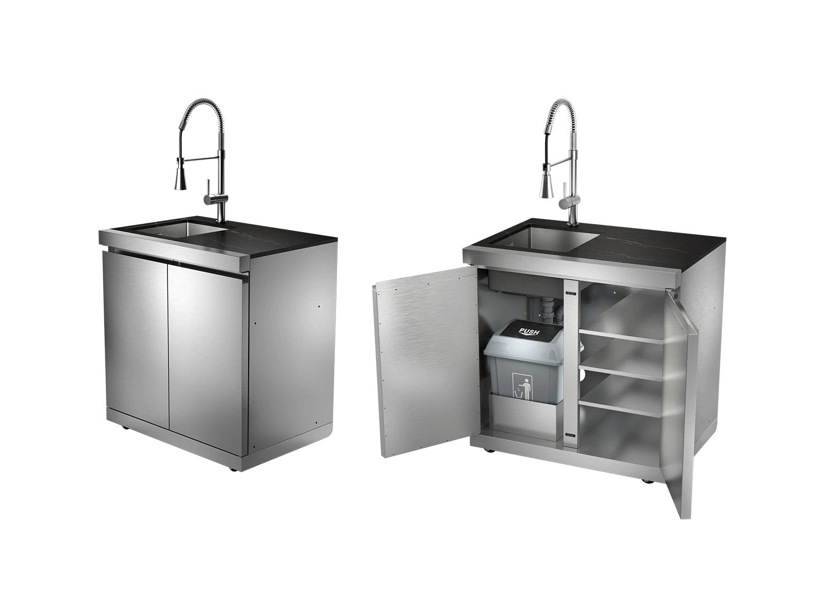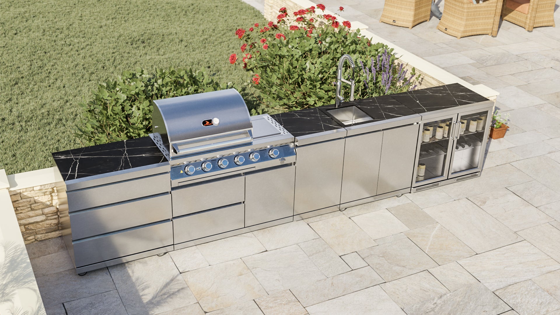 The Whistler Lechlade 4 burner BBQ Pre-built Outdoor Kitchen is a stunning design for your garden home. The outdoor kitchen system is designed with plenty of storage in mind, the triple draw unit and integrated storage in all the units helps provide a great kitchen area for cooking and entertaining. What is so great about this modular kitchen is that you can change the layout, each section can be moved to make your own design, please note you do need to keep your gas bottle on the right hand side of the BBQ at all times and your fridge should never be placed next to the BBQ.